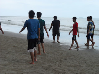Akhirnyaa kita SAMPAI uhuyyy. Waktu nyampe semua udah mencar menuju air masing-masing, gue juga dong, sambil nungguin ikan-ikan dibakar sama Ibu pos nya papah, kita main-main air, bola, kucing-kucingan, foto-foto.. Paginya sebelum berangkat gue heboh bingung sendiri soalnya gue baru inget kalo lensa kamera gue rusak, haduuuh mau pake apa? ckck akhirnya gue pagi-pagi ke rumahnya Elnoe buat pinjem pocket camera nya, untung ada *mengusap peluh*.. Gue udah gak betah main di air, sebenernya sih betah aja tapi mataharinya itu loh puanassss, sunblock aja tembus *nutup muka* akhirnya gue ke pos, tapi gue lupa jalannya -_- dengan sok taunya kita bertiga, gue, adis, ester nembus-nembus jalan, dan kita "kesasar" hahaha ngakak. And finally gue dianter sama om, anak buahnya papah ke pos, gue mandi disana, segerrr gak berasa lengket lagi.. Gue juga udah salin pake baju yang "menutup aurat" hahaha Gue balik lagi ke lokasi temen-temen, mereka semua udah mulai ambil makan, gue juga ikutan makan, beuh sadap banget, ada nila bakar, peda bakar, ayam bakar, sama kepiting asam manis slurppp udah kayak di restoran aja. Kita makan sampai selesai. Habis makan ternyata si cowo-cowo masih betah main-main di air, karna gue sama adis udah ganti baju, kita cuma foto-foto aja dipinggir pantai sama Ikrima juga, oya Ikrima punya sebutan baru loh "bule" soalnya dia doang yg nggk nyemplung ke pantai, sama dia juga yg paling putih ahaha